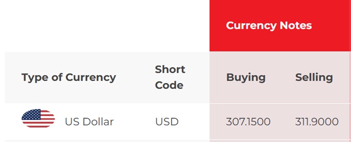 According to NDB Bank, the buying rate is unchanged at Rs. 306.75, while the selling rate is also unchanged at Rs. 313.25.
