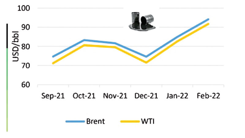 Gold prices gained 5.5% during the month and reached a nine-month high of USD 1,900 per ounce as Ukraine tensions heightened causing investors to flock to gold. Global oil prices rose sharply during the month of February and reached a seven-year high.