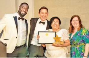 Dr. Nugawela receiving the award in UK from Final Judges Sarah James and Joshua Cort.