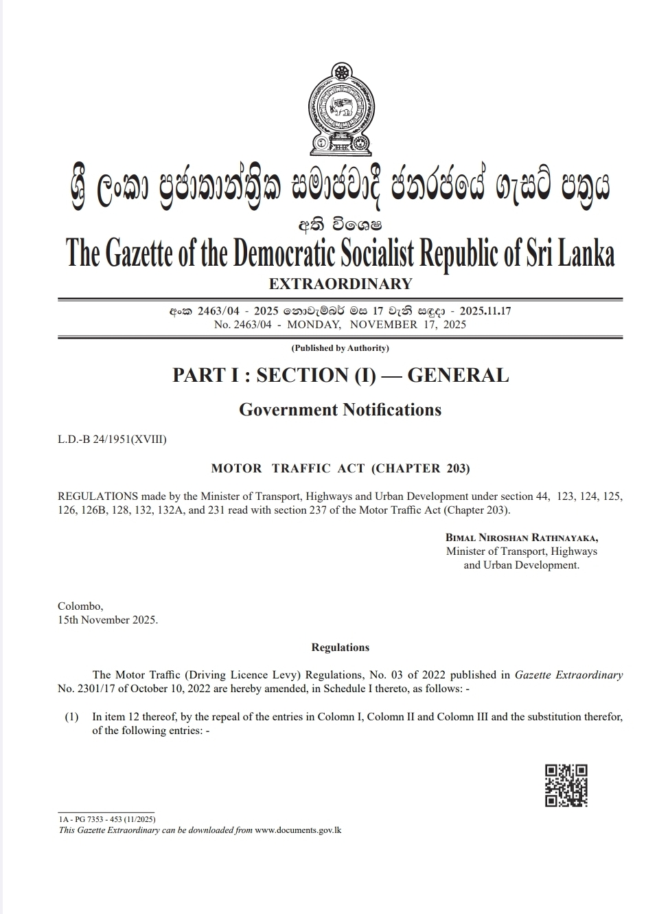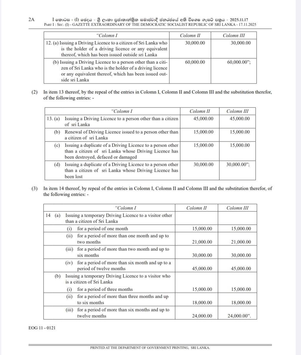 According to the Extraordinary Gazette No. 2463/04 dated 17 November 2025, the fee for issuing a driving licence to a Sri Lankan citizen who already holds a foreign licence has been set at Rs. 30,000. The fee for a foreign national in the same category has been set at Rs. 60,000.