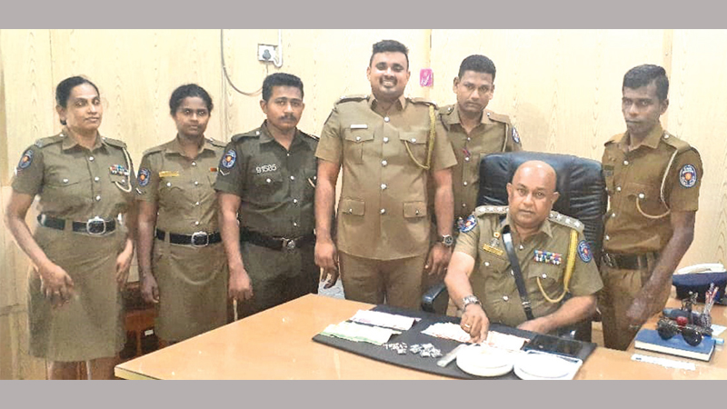 Kalutara North Police OIC CI Damith Jayathilaka and his team including Kalutara North Police Crimes OIC SI Gurusinghe with the drugs they seized in the raid.