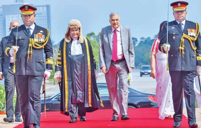 The Fifth Session of the Ninth Parliament was ceremonially declared open by President Ranil Wickremesinghe yesterday (7). The President presented the Statement of Government Policy in Parliament according to the powers vested in him under Article 33 of the Constitution. Speaker Mahinda Yapa Abeywardena and Parliament Secretary General Kushani Rohanadheera and officials welcomed the President on his arrival. Picture by Marlon Karunaratne