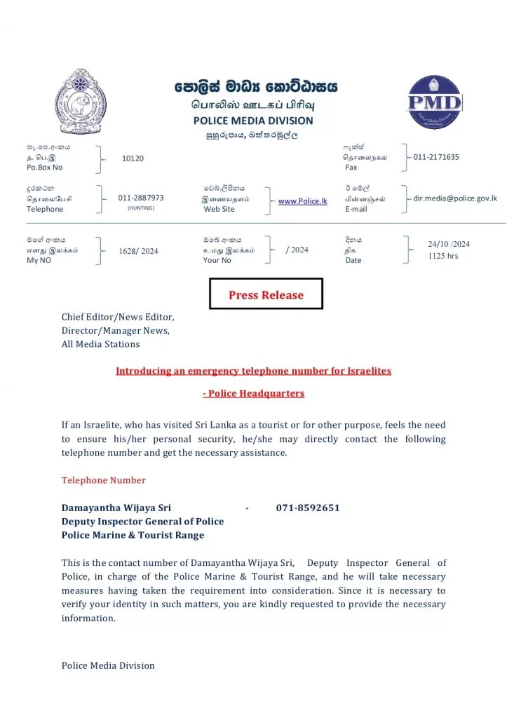 An emergency number has been introduced by the Sri Lanka Police for Israeli nationals visiting Sri Lanka, whether for tourism or other purposes, can now directly request assistance to ensure personal protection.