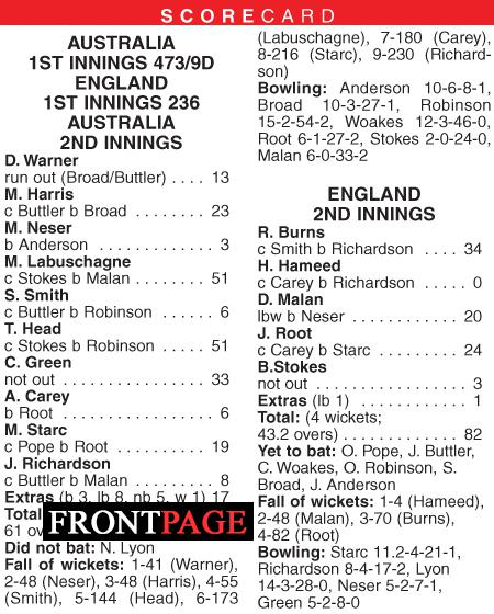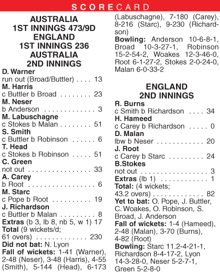 Dawid Malan was trapped lbw for 20 by Michael Neser and Rory Burns batted for 95 balls, only to edge Richardson to second slip for 34. Earlier, despite losing three wickets for seven runs in a bizarre first session, Australia moved from 45-1 to 230-9 before declaring an hour before tea.