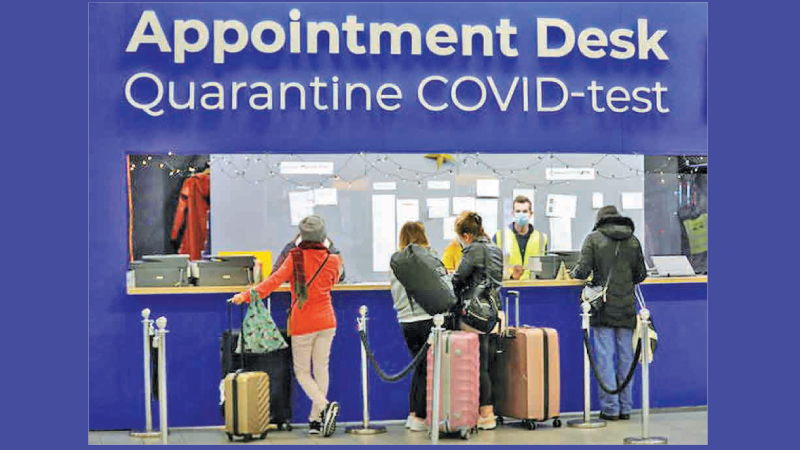 People wait in front of an “appointment counter” for quarantine and COVID-19 test appointments at Schiphol Airport in Amsterdam, The Netherlands.