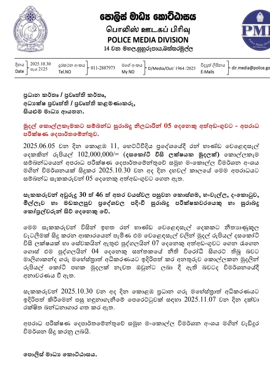Five officers attached to the Narcotics Control Unit of the Department of Excise have been arrested by the Criminal Investigation Department (CID) over the theft of Rs. 102 million from two gold jewelry shops in Colombo.