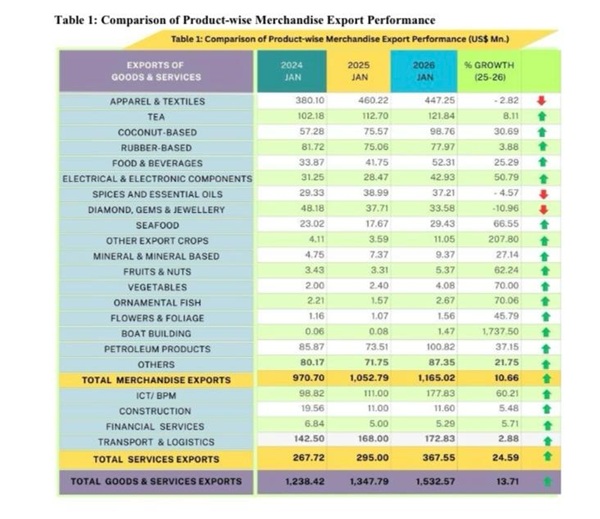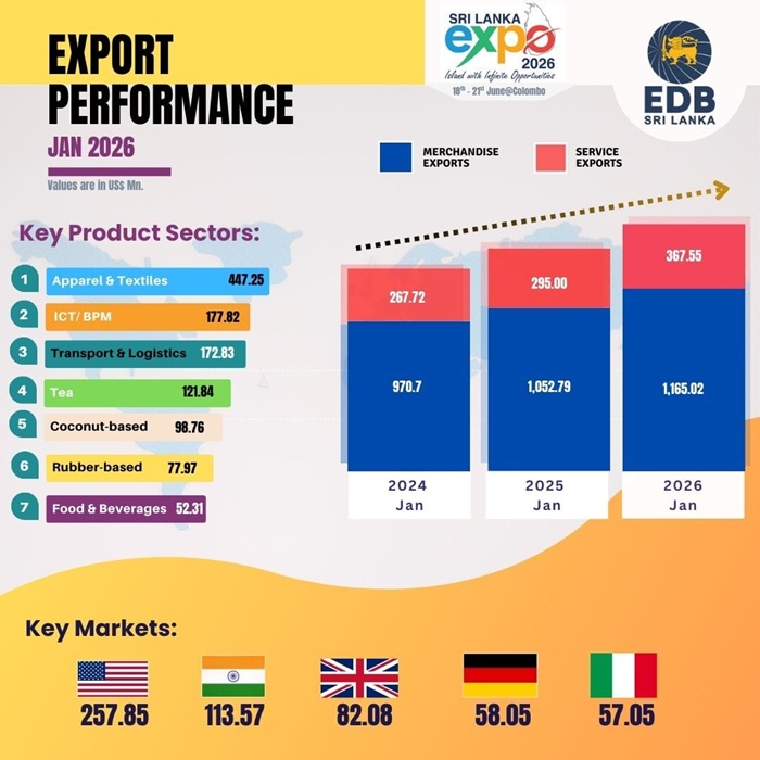 “Sri Lanka’s export earnings for January 2026 reached US$ 1,532.6 Mn, reflecting a strong year-on year growth of 13.71% and a promising start toward achieving our annual export targets. This performance highlights the resilience and growing competitiveness of the country’s export sector, supported by the gradual recovery of key international markets, sustained industrial capacity, and the continued implementation of strategic export development initiatives. We remain confident that, with focused policy support and market diversification efforts, Sri Lanka is well positioned to maintain this positive momentum throughout 2026,” Mangala Wijesinghe, Chairman and Chief Executive Officer of the EDB said.