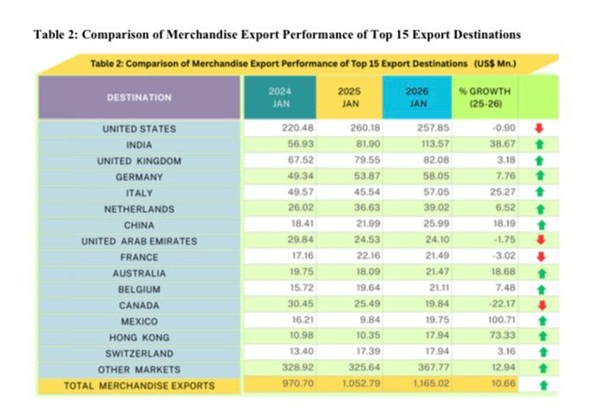 In January 2026, exports to India and Pakistan accounted for 10.5 % of Sri Lanka’s total merchandise exports, increasing 38.26 % y-o-y to US$ 122.08 Mn.