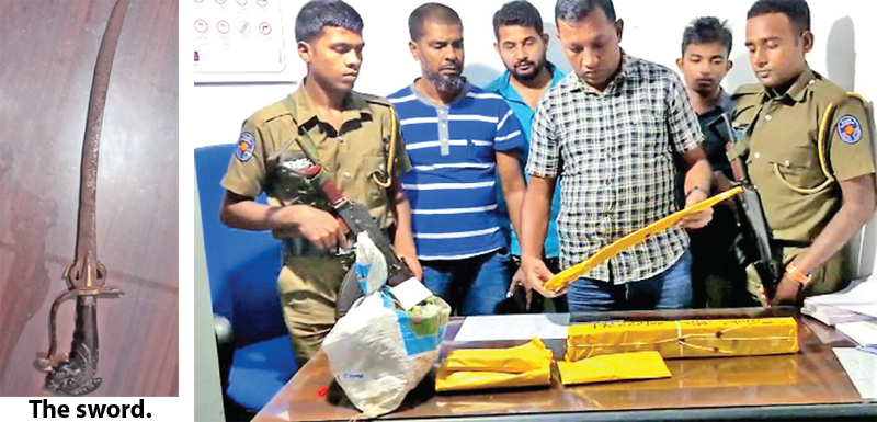The sword had been dug up from a beneath a rock inside the forest reserve in Badulla, Madolsima by a group of people including the two suspects.