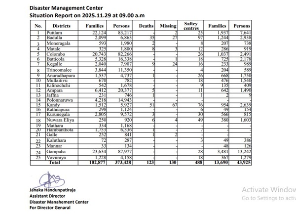 A total of 123 deaths have been reported so far in 12 districts due to the adverse weather conditions experienced in Sri Lanka.