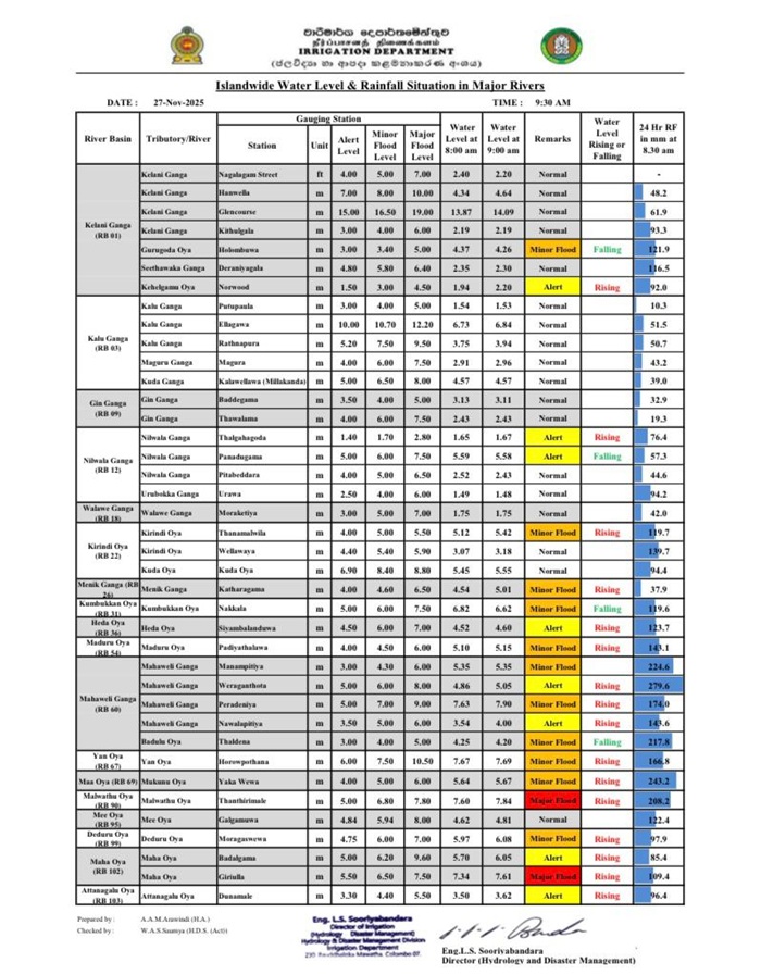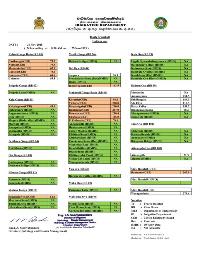 The Department of Irrigation reports that the highest rainfall in the last 24 hours ending at 08.30 am today has been reported in the Weraganthota area, recording 279.6 mm of rainfall.