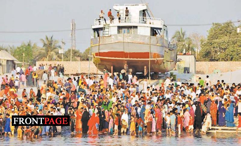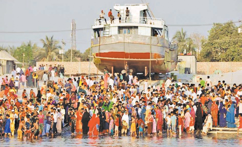 People gather at the bank of Shitalakshya river, where a ferry has sunk after colliding with a sand carrier ship in Narayanganj, Bangladesh on Sunday.