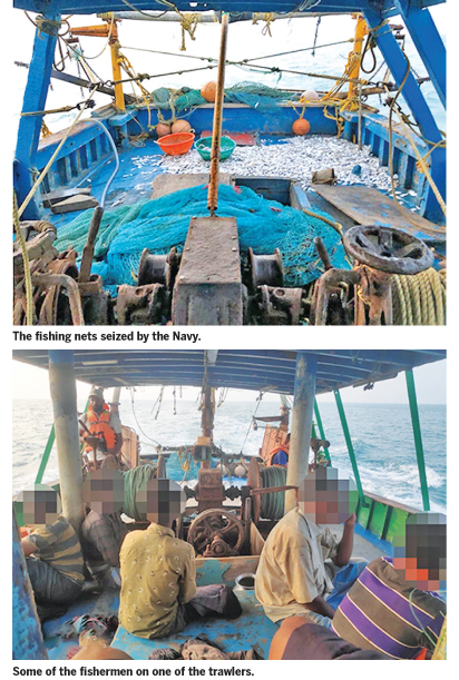 The seized trawlers together with 24 Indian fishermen were brought to the Kankesanthurai Harbour and they will be handed over to the Mailadi Fisheries Inspector for further legal proceedings.