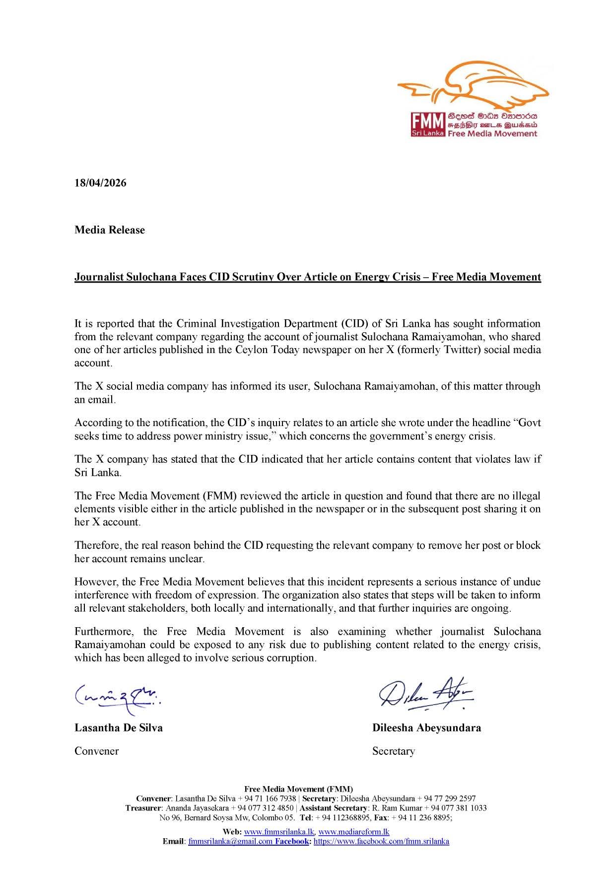 Sri Lanka’s Free Media Movement (FMM) has condemned the Criminal Investigation Department (CID) over its reported request to X (formerly Twitter) concerning a journalist’s post on the country’s energy crisis.