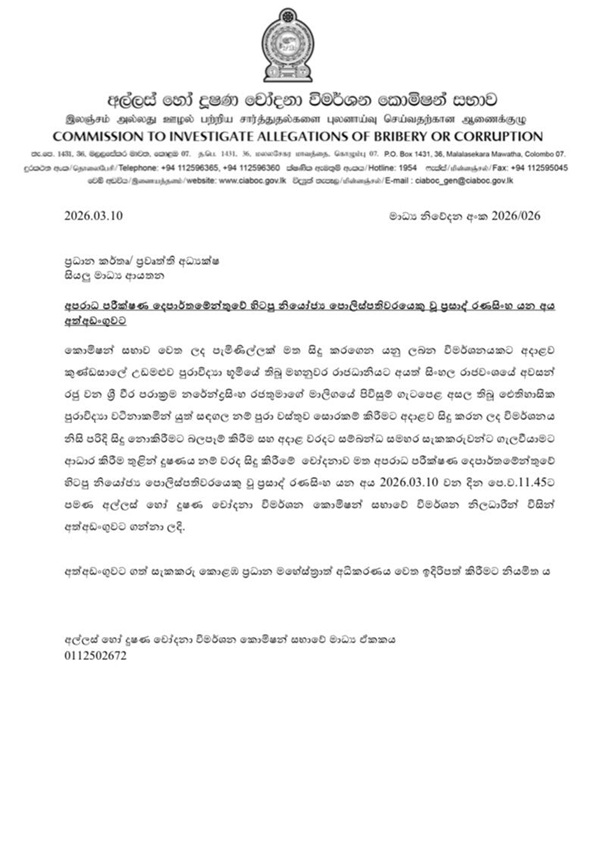 He was taken into custody at around 11:45 am today by officers of the Bribery Commission. The suspect is scheduled to be produced before the Colombo Chief Magistrate’s Court. (Newswire)