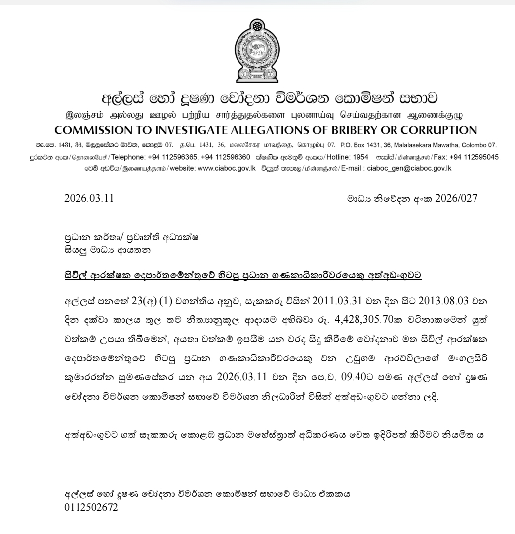 The post Former Civil Defence Chief Accountant Held Over Rs 4.4 Mn Illicit Assets Probe appeared first on Newswire.