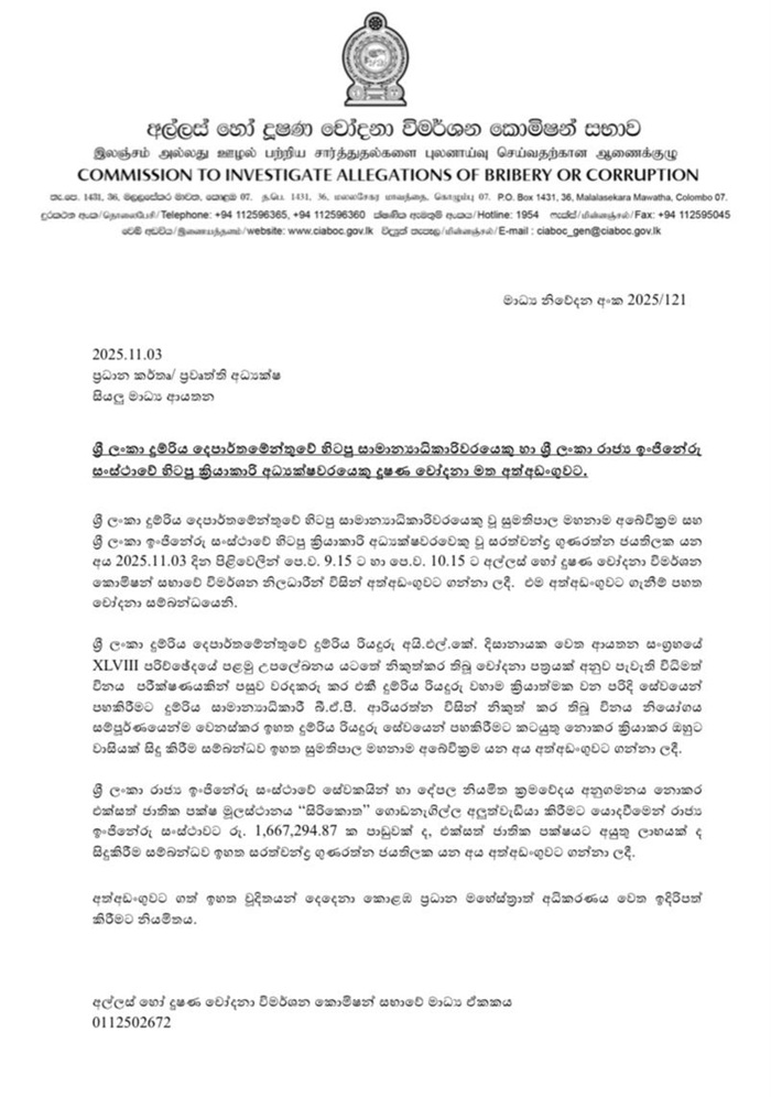 Abeywickrama was arrested in connection with a disciplinary order issued by then General Manager B.A.P. Ariyaratne, which called for the immediate dismissal of train driver I.L.K. Dissanayake following a formal inquiry.