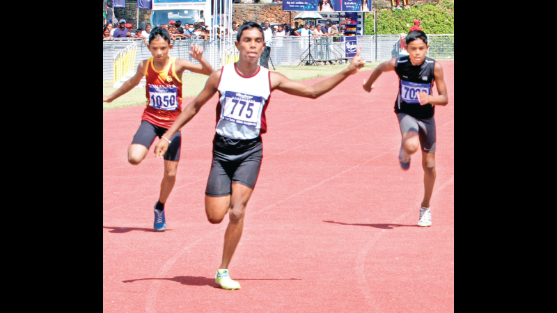 Kandy Dharmaraja’s promising athlete S.D. Hettiarachchi (775) in Under-12 80m heats. (Pix by Nissanka Wijerathne)