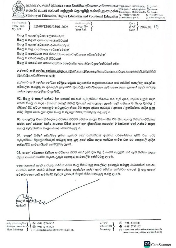 The Ministry of Education has announced a set of special guidelines to ensure the smooth continuation of daily administration and teaching–learning activities in schools while managing energy consumption during the ongoing fuel supply issue.