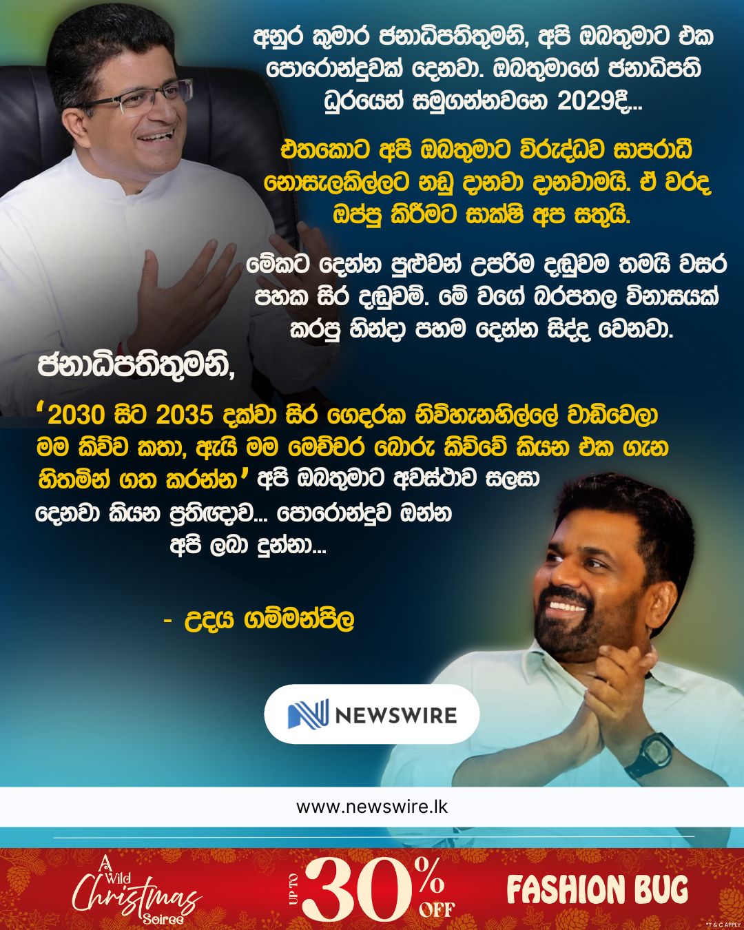 “When you step down from the presidency in 2029, we will file criminal negligence cases against you without fail,” Gammanpila said. He claimed that evidence had already been gathered to support the allegations.