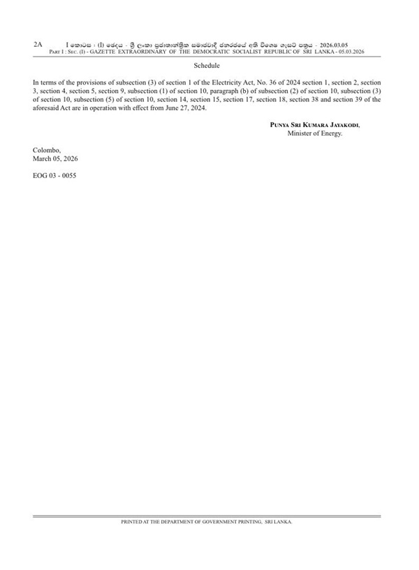 Except for certain specific clauses, the other provisions of the Sri Lanka Electricity Act No. 36 of 2024 will come into force from March 9, 2026, thereby officially restructuring the Ceylon Electricity Board.