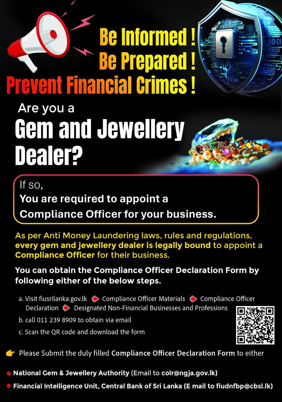 Businesses can obtain the Compliance Officer Declaration Form from the FIU website (fiusrilanka.gov.lk) or by contacting the NGJA. Completed forms should be submitted to either the National Gem and Jewellery Authority or the Financial Intelligence Unit of the Central Bank. (Newswire)