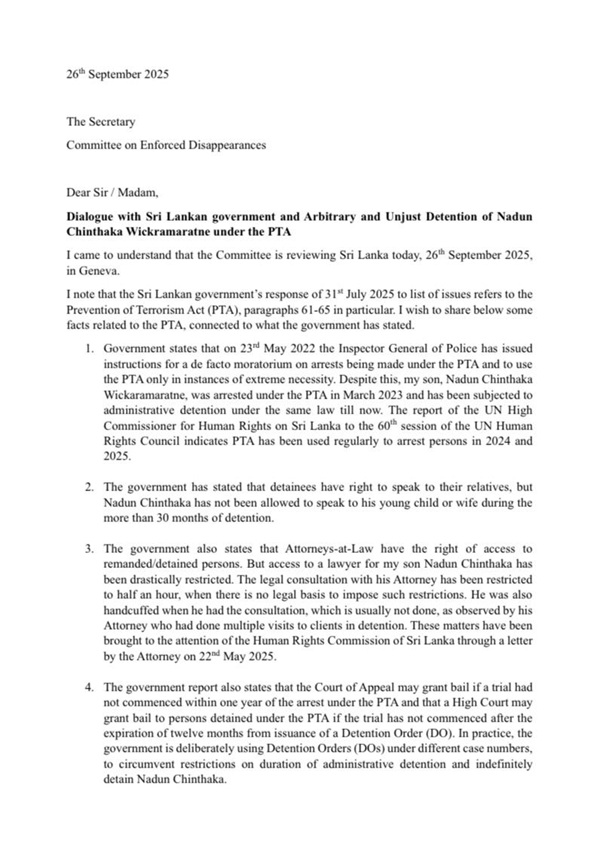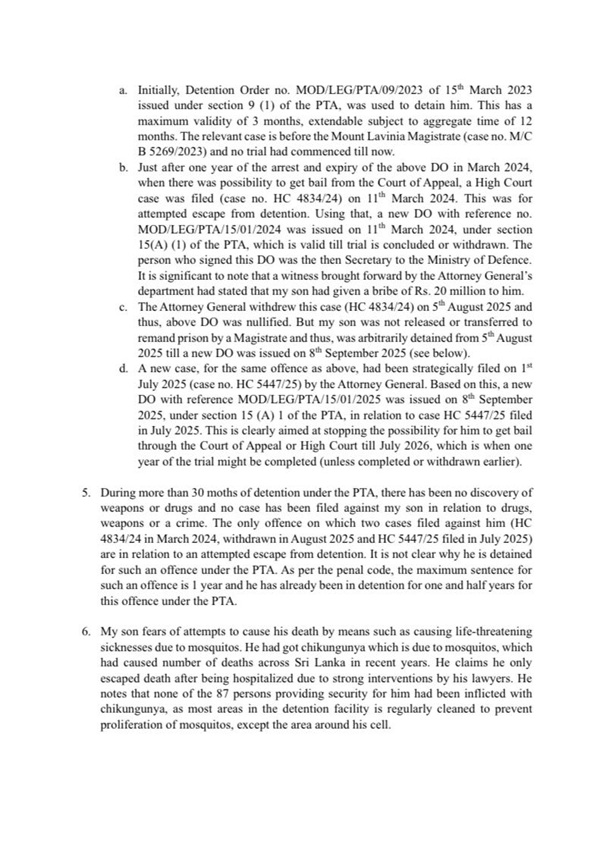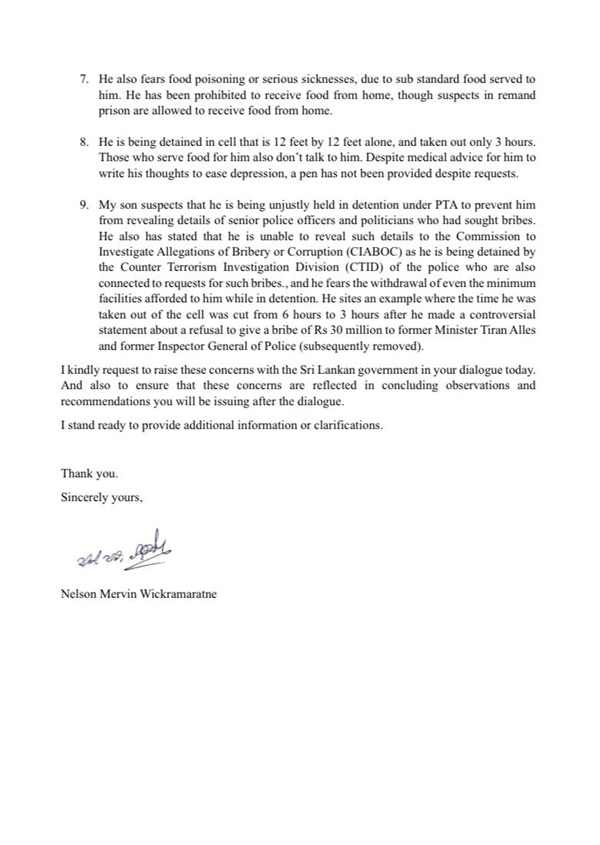 In a complaint to the Committee on Enforced Disappearances in Geneva, Wickramaratne’s father, Nelson Mervin Wickramaratne, said his son has been held for more than 30 months under successive detention orders despite no weapons, drugs, or serious criminal charges being filed against him. The only cases raised so far relate to an alleged attempted escape from custody.