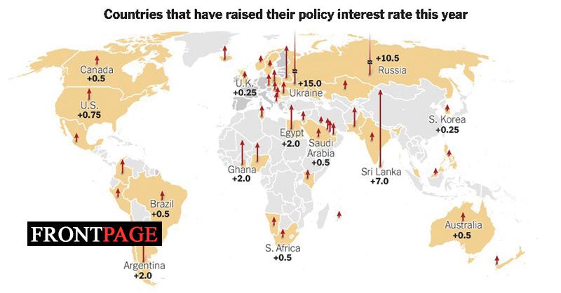 US: Nearly four dozen countries have raised interest rates in the last six months, as Central Banks in the United States, England, India and other nations push borrowing costs higher in a bid to contain the most rapid inflation in decades.