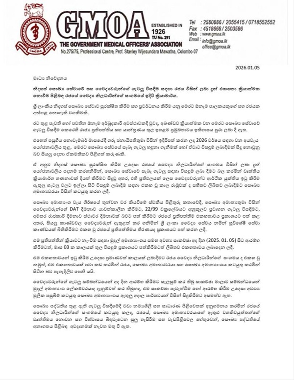The Government Medical Officers’ Association (GMOA) has announced that it will hold a special central committee meeting on Wednesday (07 Jan), to decide on future trade union action, citing the government’s failure to honour written agreements made to resolve long‑standing issues in the health sector.