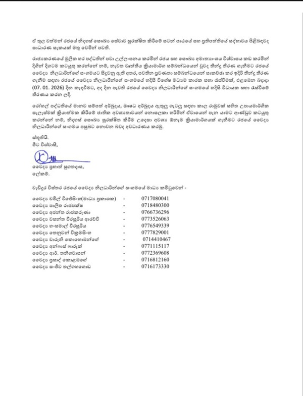 The union emphasised that protecting Sri Lanka’s free health service is a national responsibility, warning that continued disregard for doctors’ concerns and systemic issues, such as human resource shortages and drug supply crises, could lead to renewed trade union action.