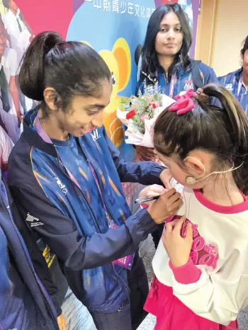A ceremony was held yesterday in Hangzhou, China to felicitate gold medalist Tharushi Karunaratne and the Sri Lanka team. This was organized under the China-Sri Lanka Youth Cultural and Sports Exchange Programme, where Tharushi and other athletes joined a group of school children in Hanjo for several activities.
