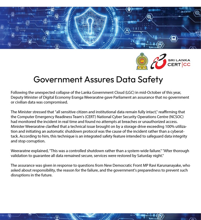 Issuing a statement, the Sri Lanka Computer Emergency Readiness Team (SLCERT) said the assurance was given by Deputy Minister of Digital Economy, Eranga Weeraratne, in Parliament recently in response to a question raised by Opposition MP Ravi Karunanayake.