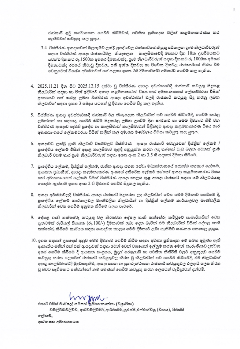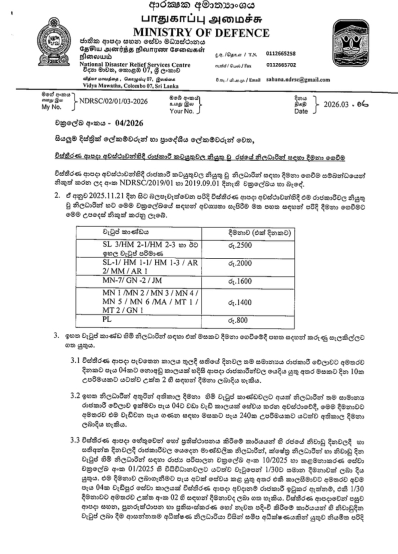 The government has doubled allowances paid to public officials engaged in extended disaster response operations under a new circular issued by the National Disaster Relief Services Centre.