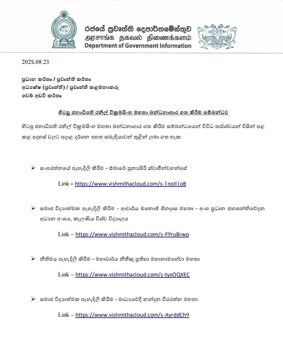 The Department of Government Information has released four explanatory videos on the imprisonment of former President Ranil Wickremesinghe.