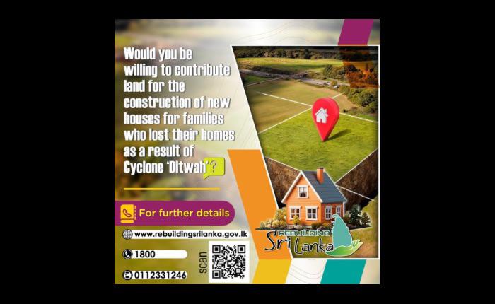 The Government is calling on citizens across Sri Lanka to donate land to support the construction of permanent housing for families who lost their homes during Cyclone Ditwah, the Department of Government Information said.