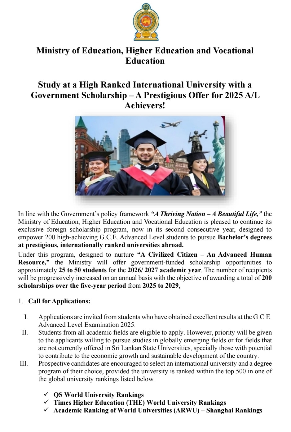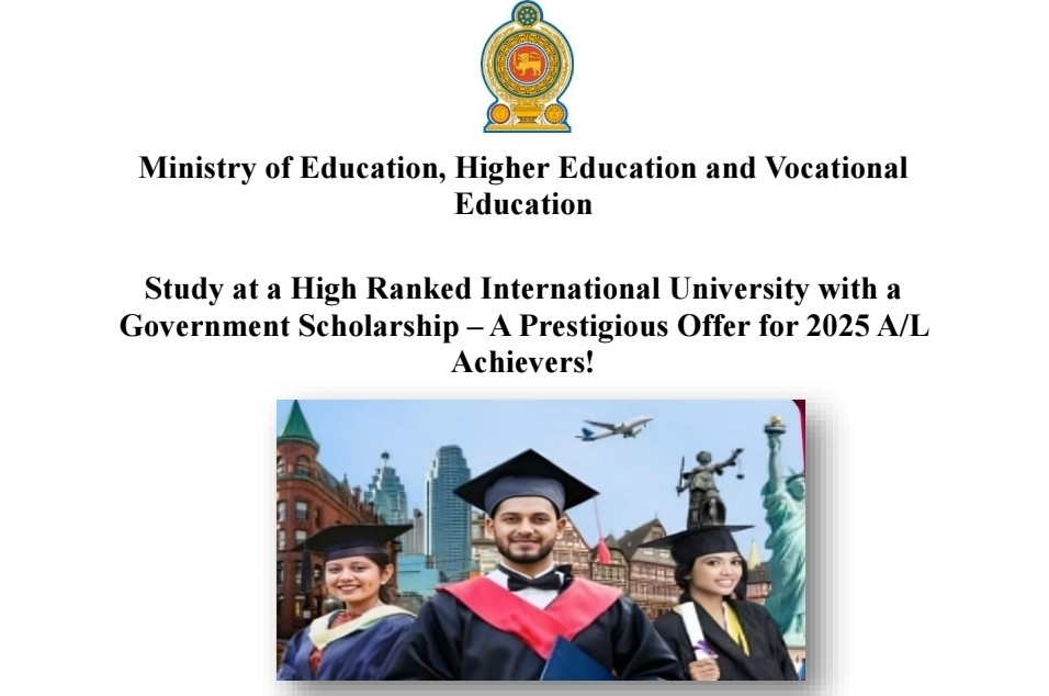 The Ministry of Education, Higher Education and Vocational Education has called for applications from high-performing students of the 2025 G.C.E. Advanced Level examination for a government-funded foreign scholarship programme.