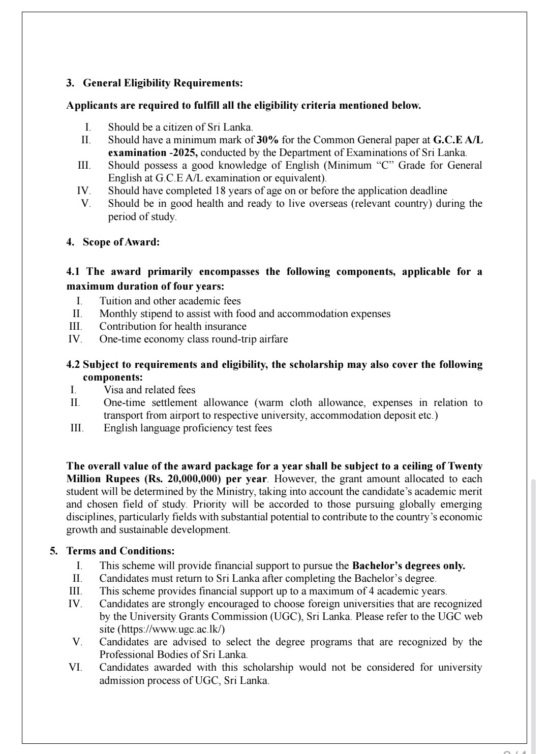 The Ministry noted that the annual value of the scholarship package could reach up to Rs. 20 million per student, depending on academic merit and field of study.