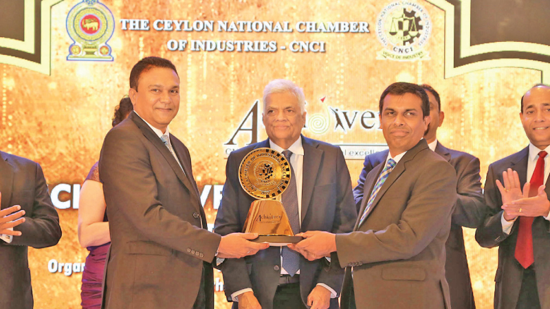 President Ranil Wickremesinghe presented the ‘CNCI Achiever National Gold Award’ for Extra-large Manufacturing category to Alumex PLC. Here Alumex Managing Director Pramuk Dediwela and Director & Chief Financial Officer Prageeth Rajapaksha with the award. Picture by Sulochana Gamage