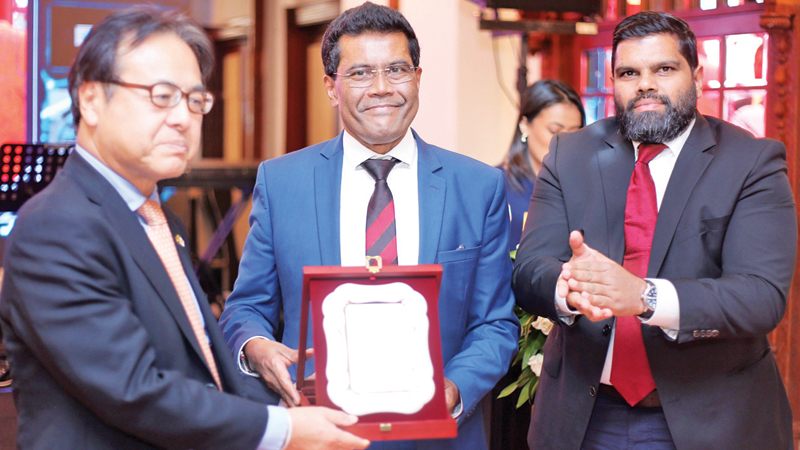 FTZMA Chairman Dhammika Fernando presenting a token of appreciation to Chief Guest Japanese Ambassador Mizukoshi Hideaki. Picture by Marlon Karunaratne.