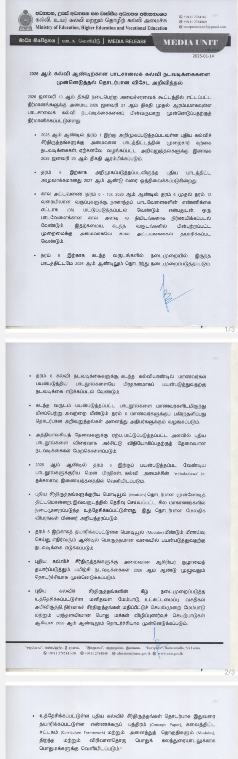 Ministry of Education has issued guidelines for conducting Grade 6 – 13 educational activities this year after postponing the implementation of the new Grade 6 educational reforms until 2027.