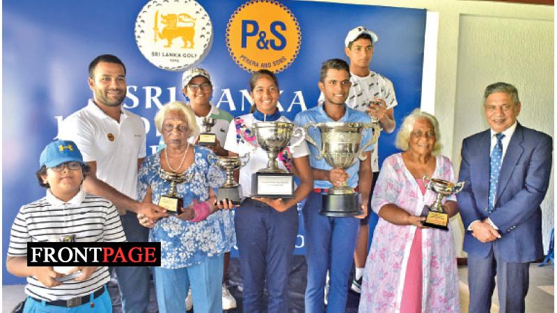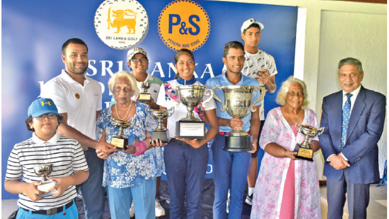 Rukmani Kodagoda Trophy Junior Golf Championship Awards Ceremony was held under the patronage of Mrs. Shan Perera, sister of Rukmini Kodagoda just after the finals at Royal Colombo Golf Club yesterday. Here the winners from (left to right)Yuwan Rathis kanth Copper Winner, Thejas Rathis kanth – Bronze winner, Kaya Daluwatte Gold and Silver winner ladies, Haroon Aslam Overall and Gold Boys winner and Reshan Algama – silver winner. along with Avishka Perera, Mrs. Srima Seneviratne sister of Mrs Rukmini Kodagoda and Lal Wickrematunge Secretary Sri Lanka Golf look on. PICTURE BY – HERBERT PERERA