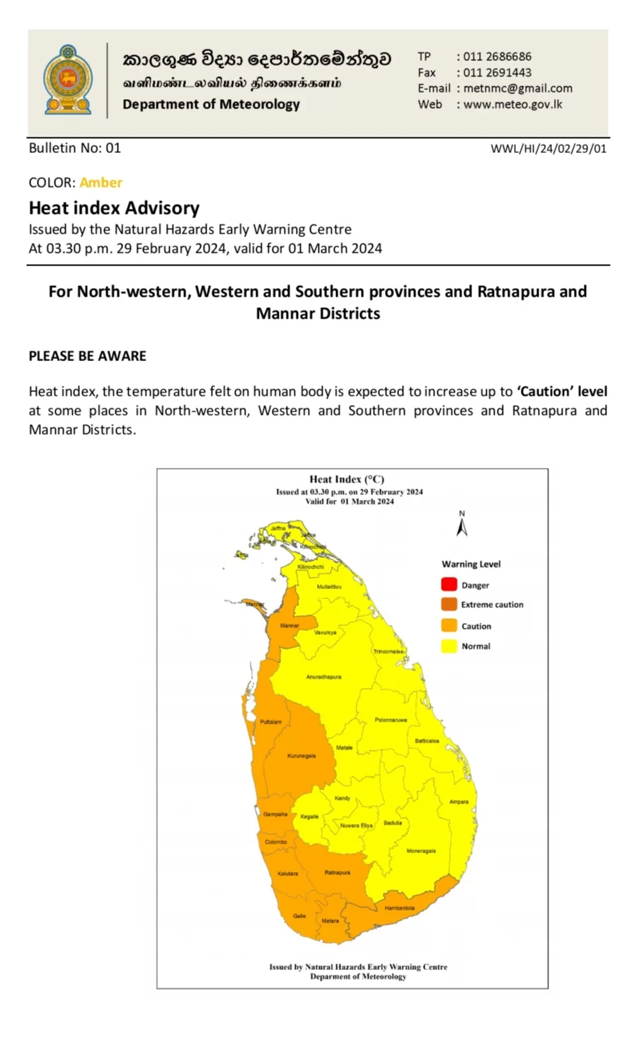 Heat index, the temperature felt on human body is expected to increase up to ‘Caution’ level at some places in North-western and North-central provinces and Gampaha, Colombo, Hambantota and Trincomalee District North-western, Western and Southern provinces and Ratnapura DistrictsNorth-western, Western and Southern provinces and Ratnapura and