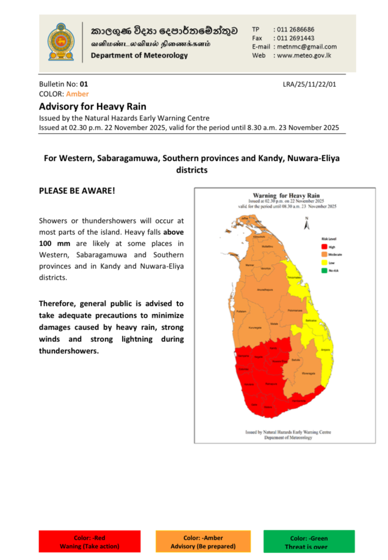 Showers or thundershowers will occur at most parts of the island. Heavy falls above 100 mm are likely at some places in Western, Sabaragamuwa and Southern provinces and in Kandy and Nuwara-Eliya districts.