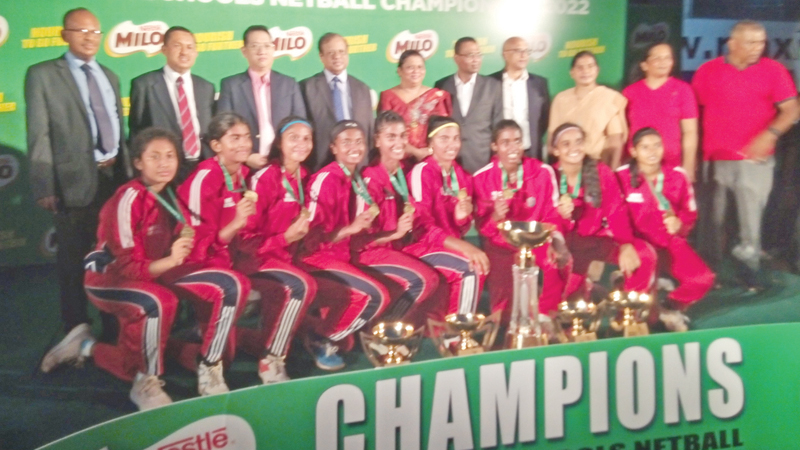 Holy Family Convent Kurunegala under 19 Netball champions team with chief guest Education Minister Susil Premajayantha, Additional Secretary to the Education Ministry Hemantha Premathilake, Milo MD Jason Avensana, Nestle Lanka Vice Presidents Bandula Egodage and Ruwan Welikala, Nirodha Abeywickrama President of the Sri Lanka schools Netball Association, Rev Sister Timali Lowe Deputy Principal of HFC Kurunegala. (pic by Dhammika Ratnaweera)
