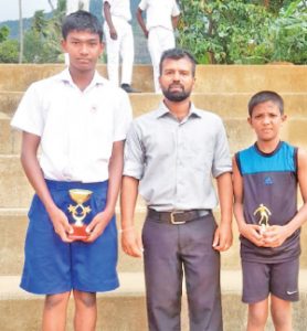 from left – Y. Tharnesh (Putt Shot) in the under 14 category, middle – Coach, Mahesh Sampath Preethiwardena and right – J.Jaganandru (Long Jump) in the under 12 category, was adjudged as the best athletes in their respective categories and fields.
