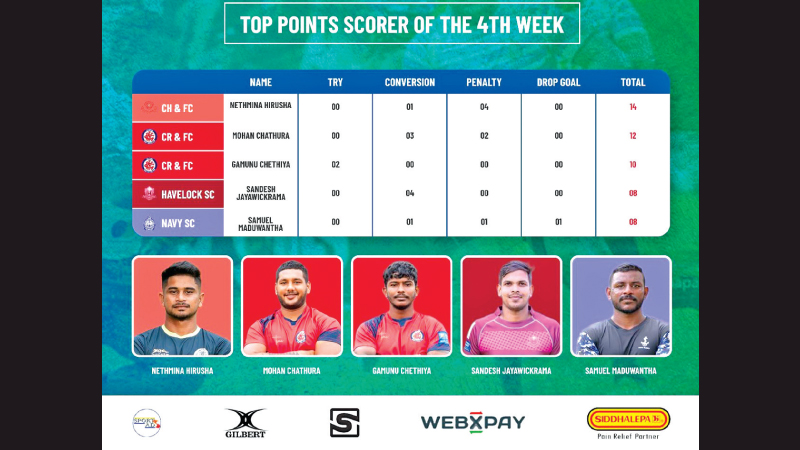 CR and FC’s wing three quarter Gemunu Chethiya also had a memorable outing as he scored twice against the CH and FC to finish in third place among the top individual performers during the week.