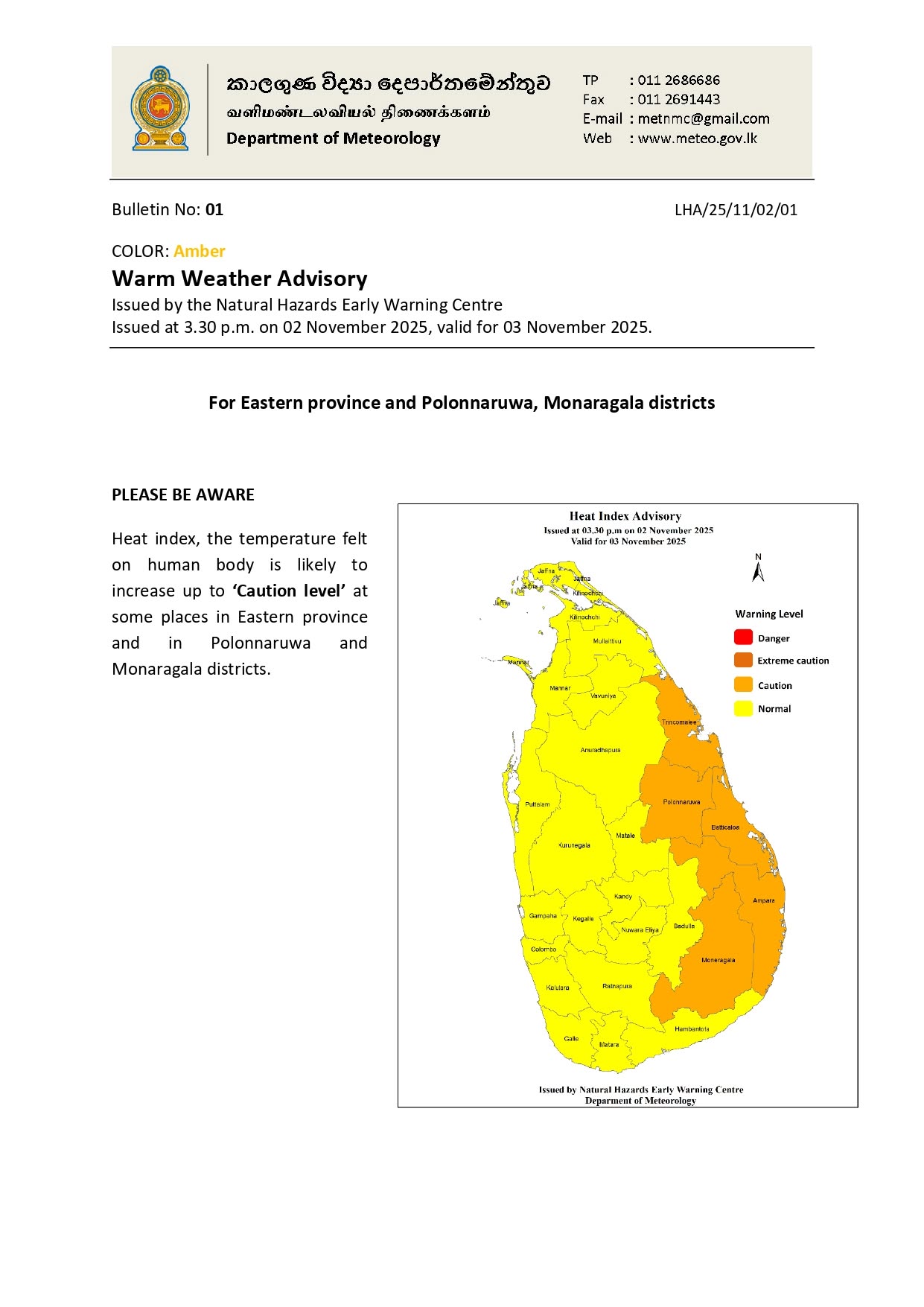 According to the advisory issued at 3:30 p.m. on November 2 and valid for November 3, 2025, the heat index — the temperature felt on the human body — is expected to increase up to the “Caution level” in several areas of the Eastern Province as well as the Polonnaruwa and Monaragala districts.