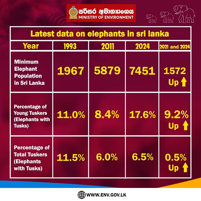 Sri Lanka’s elephant population has recorded a notable increase, according to the latest figures released by the Ministry of Environment, with the minimum estimated number rising to 7,451 in 2024.