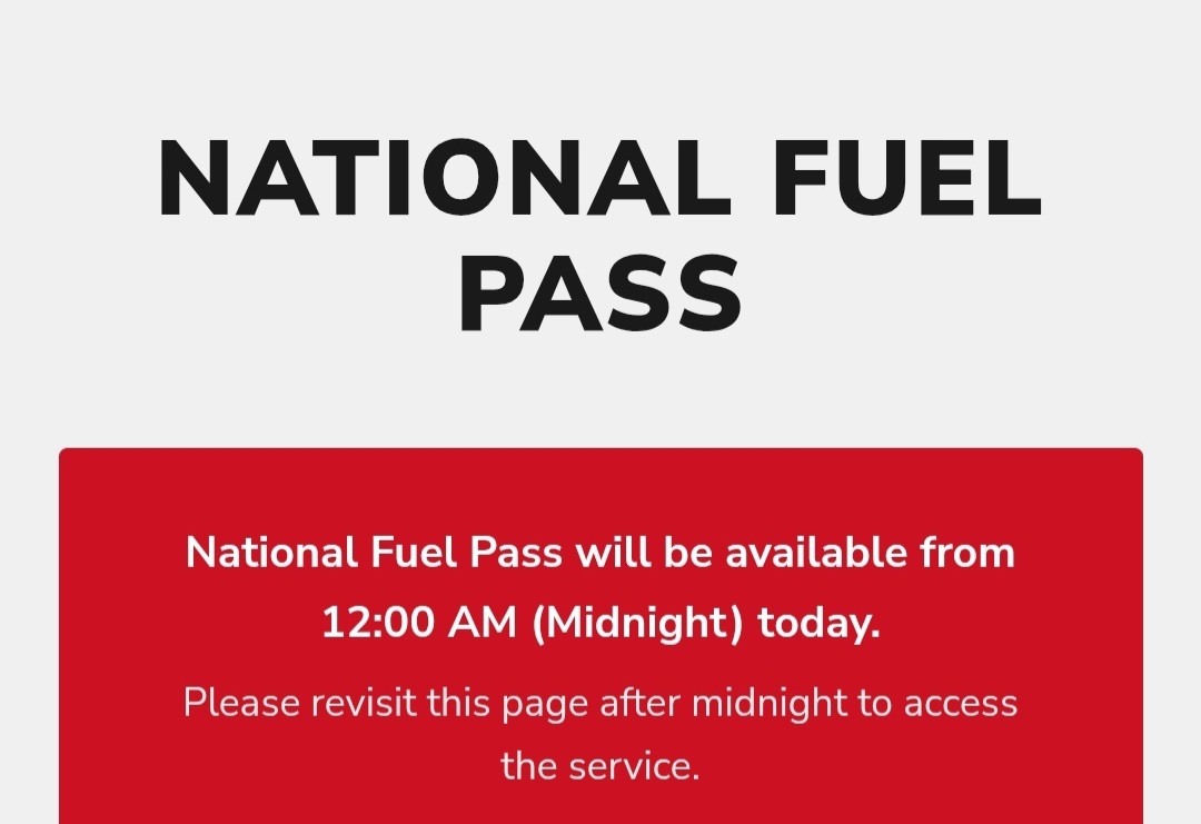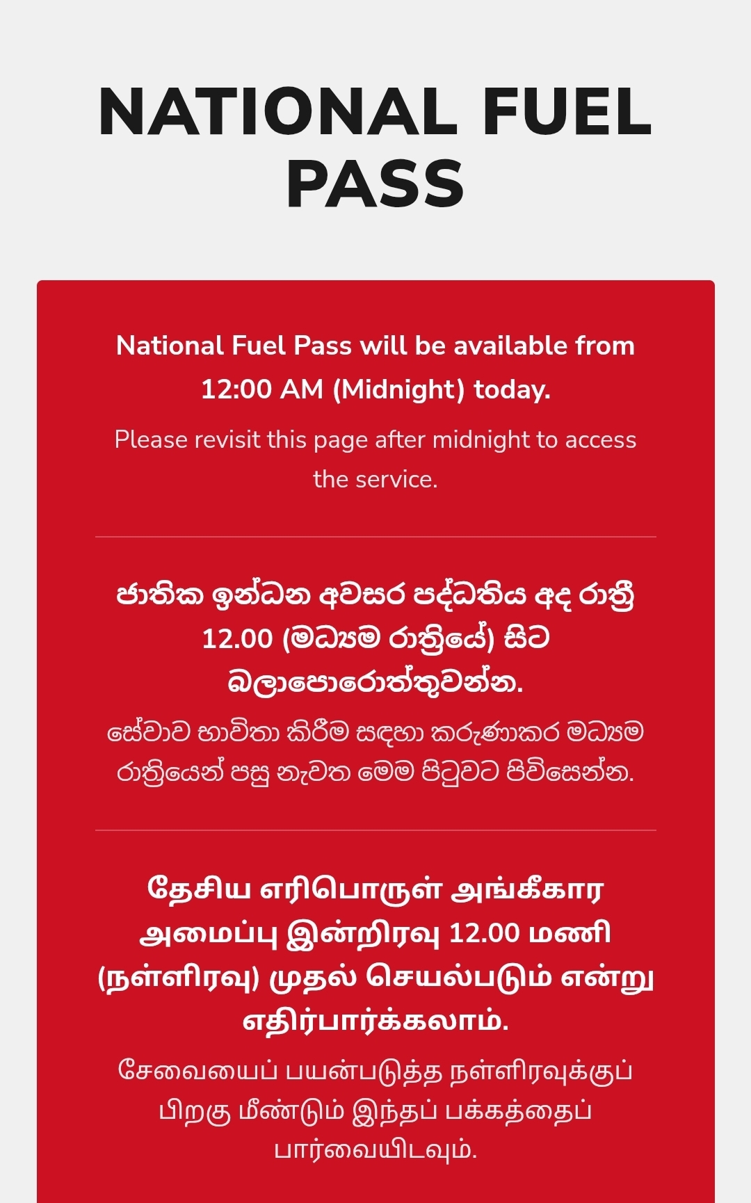 The National Fuel Pass (Fuel QR) website indicated earlier that the service would be available from 12:00 a.m. (midnight) today, asking users to revisit the page after midnight to access the system.