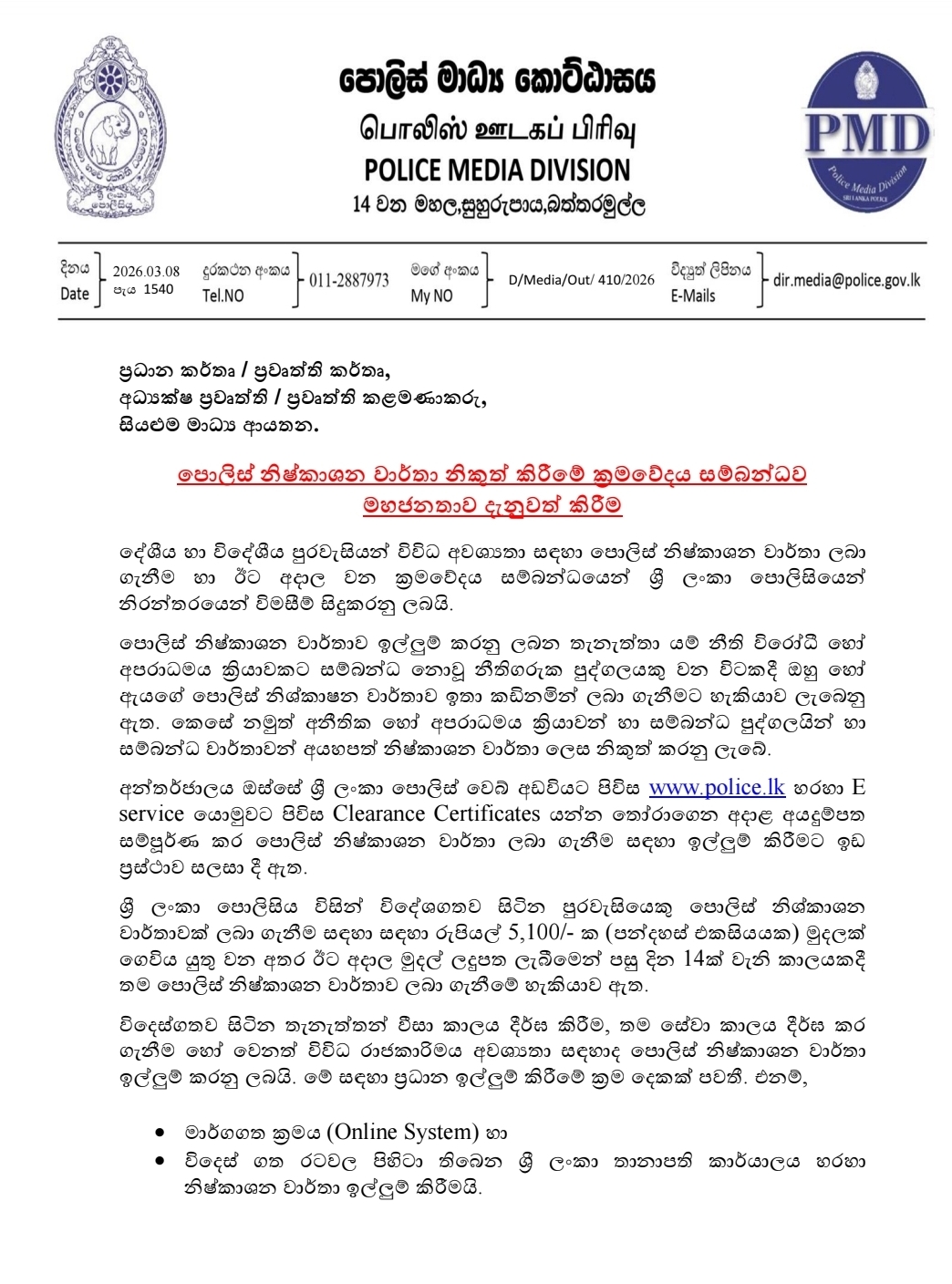Sri Lanka Police on Sunday issued a public advisory clarifying the official procedures for obtaining Police Clearance Certificates (PCC) following a high number of inquiries from both local and overseas applicants.